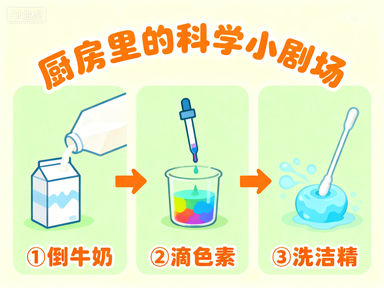 - 魔法时刻:当沾了洗洁精的棉签戳进牛奶,色素会像被施了魔法般炸开,形成流动的大理石花纹(原理:洗洁精破坏牛奶表面张力,脂肪分子 “逃跑” 时带动色素流动)。