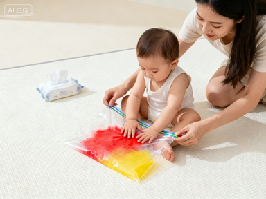 - 玩法:把无毒的手指颜料挤在密封的拉链袋里(别太多,每种颜色一小块),封紧拉链(再用胶带粘一圈,防止漏),递给宝宝说 “宝宝按一按,看看颜色会变吗?”,宝宝会用手拍、按袋子,颜料会在里面晕开。