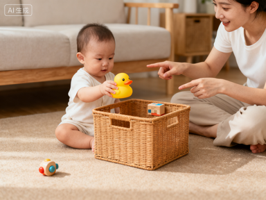 - 玩法:找一个敞口的小筐 / 塑料盒,准备 3-4 个宝宝的小玩具(比如小积木、小鸭子),你先把玩具放进筐里,说 “玩具回家啦~”,然后把玩具拿出来,递给宝宝,鼓励 TA 把玩具放进筐里。