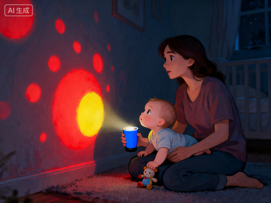 - 玩法:晚上拉上窗帘(不用全黑),把手电筒放进透明的彩色塑料杯里(红、黄、蓝都可以),杯子会透出彩色的光,你拿着杯子慢慢移动,说 “宝宝看,红色的光来啦~”,也可以把光投在墙上,让宝宝追着光看。