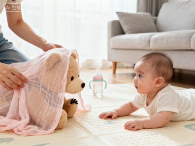 - 玩法:把宝宝熟悉的毛绒玩具 / 小绘本盖在柔软的纱布毯下,露出一点点边角(比如玩具的耳朵),笑着说 “小熊躲哪里啦?宝宝找找看!”,如果宝宝没头绪,可以轻轻掀起毯子一角引导。