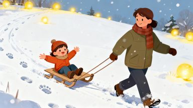 - 玩法:家长拉着雪橇让娃坐(慢一点!),或者娃自己趴在上面慢慢滑,记得戴手套和帽子,玩 10 分钟就歇会儿暖手。