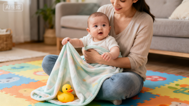 把宝宝常玩的小玩具(比如软乎乎的小鸭子、牙胶)放在薄毯子下,只露出一点点边角(比如鸭嘴、玩具的彩色手柄),然后用夸张的语气说:“咦?小鸭子去哪啦?宝宝找找看~” 如果宝宝没反应,就轻轻掀一点毯子引导,找到后一起欢呼 “找到啦!”