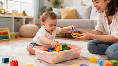 找一个浅口塑料盒(比如宝宝的辅食盒、空的湿巾盒),放 2-3 个小玩具(比如小积木块、软质小汽车,直径大于 3 厘米);你先示范:把玩具放进盒子里,再倒出来,说 “把小熊放进去,再拿出来~”,然后让宝宝自己试(哪怕他只会把玩具扔在盒子外面,也别着急,慢慢引导)。