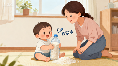 找一个干净的塑料瓶(比如空的辅食瓶、矿泉水瓶),装满干燥的大米或小颗粒意大利面,拧紧瓶盖(最好再用胶带缠一圈,防止宝宝拧开);把瓶子递给宝宝,先示范 “摇一摇”,让他听 “沙沙沙” 的声音,然后说:“宝宝也摇一摇,听听有没有声音呀?”