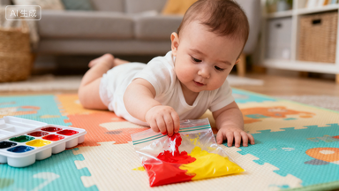 找一个厚实的拉链密封袋(比如食品保鲜袋),挤一点宝宝专用手指颜料(选无毒、易清洗的)进去,然后把袋子里的空气挤掉,拉严拉链(再用胶带把拉链处缠一圈,防止宝宝拉开);把袋子放在爬爬垫上,让宝宝用手拍、用手指戳,看里面的颜料混在一起变成新颜色(比如红色 + 黄色变成橙色),你可以说 “宝宝看,颜色变魔术啦!”