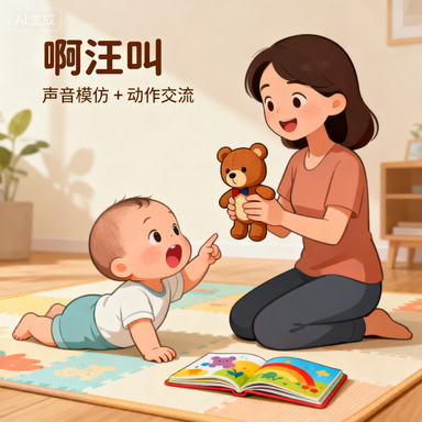② 「玩声音游戏」:拿动物玩偶和娃互动,学小狗叫 “汪汪”、小鸡叫 “叽叽”,等娃跟着模仿后,及时夸 “宝宝学得真像,这是小狗的声音呀”;