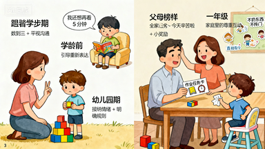 一年级孩子开始有 “小主见”,甚至会故意 “跟你对着干”—— 比如你问 “现在要不要写作业呀?”,他大概率说 “不要!”;但如果你说 “现在我们先写 20 分钟作业,写完就能玩 10 分钟积木”,他反而会配合。
