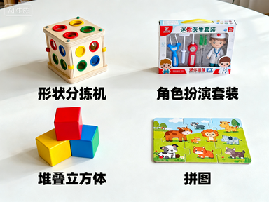 | 联想 / 合作阶段 | 角色扮演套装(医生工具、厨房玩具)、2-4 片拼图、户外沙包 | 促进分工协作、主题互动 |