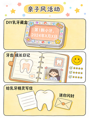 - “新牙庆祝餐”:等乳牙掉了,带孩子去吃他喜欢的食物,告诉孩子“这是庆祝你长新牙的礼物,新牙齿更坚固,以后能吃更多好吃的啦”。