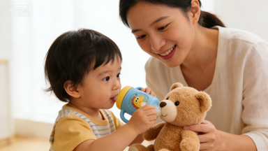 - “干杯”小游戏:家长也拿一个杯子(装温水),和孩子的吸管杯“干杯”,说“干杯!我们一起喝,看谁喝得又快又香”;