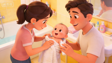 快速擦干:立即抱出宝宝放在大浴巾上,包裹住身体轻轻按压吸干水分(不要来回揉搓,避免损伤娇嫩皮肤),重点擦干耳后、颈部、腋下、腹股沟等褶皱处。