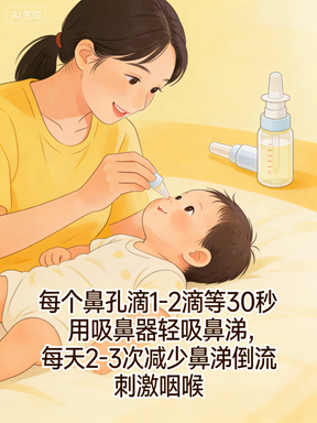 - 家庭护理:垫高宝宝上半身睡觉;用生理盐水喷鼻剂清洗鼻腔,减少鼻涕倒流。