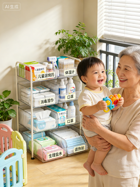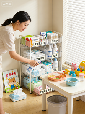 物资储备:在娃的收纳区留一个 “应急小角落”放娃的即食辅食 / 米粉 / 小馄饨、独立包装的奶粉、免洗洗手液、儿童口罩、娃的常用退烧药(如美林、泰诺林,标注好剂量);自己的常用药(退烧药、感冒药、润喉糖)、一次性医用口罩、消毒湿巾、一次性餐具 / 水杯,不用每次生病临时翻找。