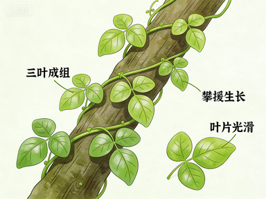 - 叶片特征(关键):叶柄上只长3片小叶,呈“品”字形排列(俗称“三叶藤”),是三者中叶片数量最固定的。小叶形状多为椭圆形、卵形,边缘光滑,或有轻微的波浪纹(很少有明显锯齿);叶片表面有光泽,颜色随季节变化——春天嫩绿、夏天深绿、秋天变红或橙黄,落叶后茎干呈红褐色,上面可能长有细小的气生根(用来攀附)。